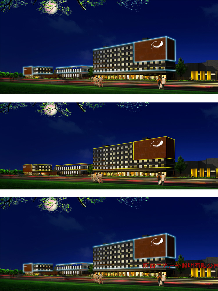簡介—— 菜鳥亮化項目是我公司和阿里巴巴西安菜鳥公司溝通,做的初步設計效果圖,結合菜鳥配送中心的功能性,在主樓體做發光亮化效果,主要采用線條燈勾勒,點光源點綴效果,到達客戶需求的亮化效果。